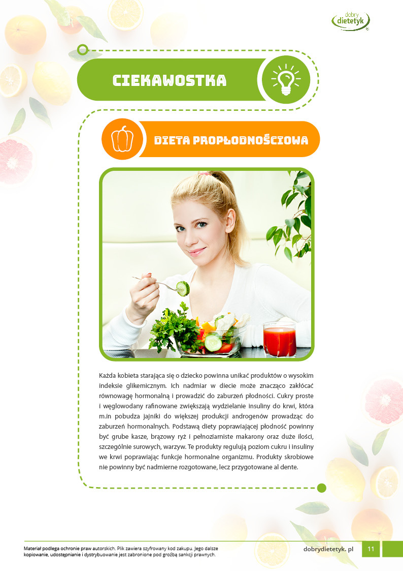 Ten wyjątkowy 30-dniowy program dietetyczny został specjalnie opracowany przez zespół dietetyków dla kobiet planujących ciążę. Jest to dieta przygotowana w celu poprawienia płodności oparta na żywności naturalnej, niskoprzetworzonej, bogatej w składniki pokarmowe potrzebne do osiągnięcia równowagi hormonalnej, funkcji reprodukcyjnych i późniejszego, prawidłowego rozwoju płodu. Jest to dieta bardzo pomocna w zrównoważeniu istniejących problemów z płodnością oraz zgromadzeniu zapasów składników odżywczych. W diecie położono szczególny nacisk m.in. na: odpowiednią podaż pełnowartościowego białka, wymaganych kwasów tłuszczowych, wysoką zawartość żelaza, folianów, witaminy B12, cynku i wielu innych składników odżywczych.
